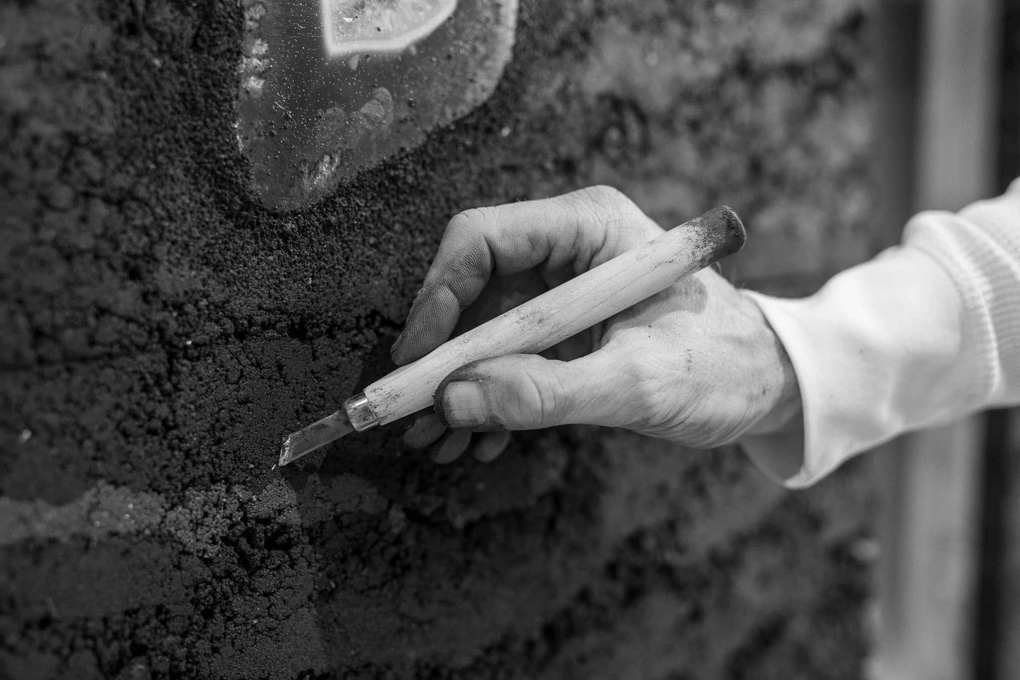 En el centro de la exposición, los paneles de arcilla sin cocer de Adam Weismann se construyen mediante compresión y estratificación, haciendo visibles la densidad y el trabajo físico implicado. La superficie conserva el rastro de su elaboración, subrayando la relación entre construcción y representación.